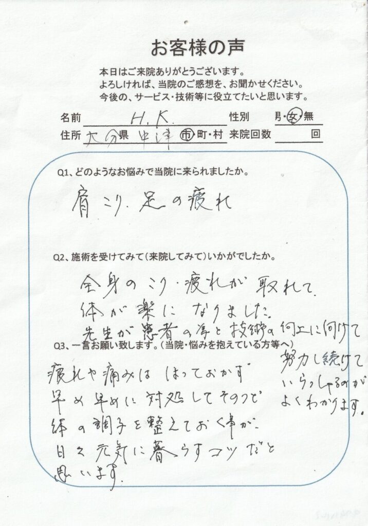 全身のこり、疲れが取れて、体が楽になりました。